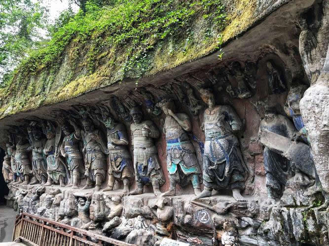 大足石刻開鑿于唐永徽元年(公元650年),盛于宋代,F(xiàn)存摩崖石刻造像5萬余尊,銘文10萬余寧,遍布100多處。其中比較重要的有北山(包括北塔)、寶頂山、南山、石門、石篆山石刻,是大足石刻中規(guī)模最大藝術價值最高的石刻造像代表。