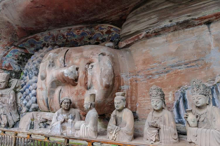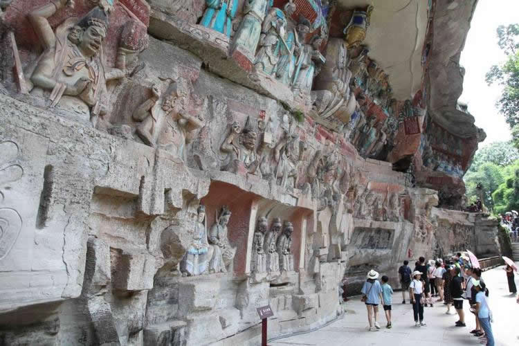 重慶市的大足石刻以其規(guī)模宏大、雕刻精美、題材多樣、內涵豐富和保存完整而著稱于世。它集中國佛教、道教、儒家“三教”造像藝術的精華,以鮮明的民族化和生活化特色,成為中國石窟藝術中一顆璀璨的明珠。它以大量的實物形象和文字史料,從不同側面展示了九世紀末至十三世紀中葉中國石刻藝術的風格和民間宗教信仰的發(fā)展變化,對中國石刻藝術的創(chuàng)新與發(fā)展做出了重要貢獻,具有前代石窟不可替代的歷史、藝術和科學價值。許多歐洲人、尤其是法國人,對大足石刻寵愛倍加。