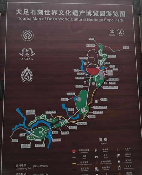 大足石刻分布于該縣西南、西北和東北的扇區(qū),共23處。較集中的有寶頂山、北山等19處。其中以寶頂山摩崖造像規(guī)模最大,造像最精美。除佛像和道教造像外,也有儒、佛、道同在一龕窟中的三教造像,而以佛教造像所占比例最大。