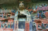 公元十世紀后期至十二世紀中葉的宋代造像題材廣泛,多達21種,尤以觀音最為突出,被譽為“中國觀音造像的陳列館”。這一時期的作品更加貼近生活,體現(xiàn)了宋代的審美情趣。造像具有人物個性鮮明,體態(tài)優(yōu)美,比例勻稱,穿戴艷麗等特點。最具代表性的是建于公元1142—1146年間的第136號轉輪經(jīng)藏窟。該窟造像以恬靜的面部刻劃反映其內心之寧靜,以玲瓏的衣冠顯其身份的高貴。以線造型,線面并重,富有中國民族特色。瓔珞蔽體,飄帶滿身,花簇珠串,玲瓏剔透,裝飾味濃;且多保存完好,宛如新刻,被公認為是“中國石窟藝術皇冠上的一顆明珠”。其它如第125號數(shù)珠手觀音、第113號和第133號水月觀音、第155號孔雀明王窟、第177號泗洲大圣龕、第180號十三觀音變相窟等都是這一時期的珍品。這些造像的形象、姿態(tài)、性格、神情以至衣褶、飾物等,組合變化豐富,刻工精美,步步移,面面觀。