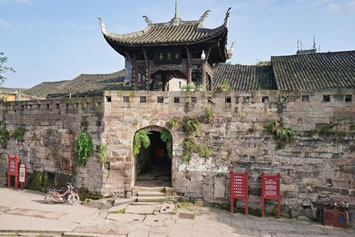 日月門:系大榮寨的四大城門之北門,門樓上有日月亭,門內即煙雨巷,“橋橫古渡煙霞聚,寨聳雄關日月巡”。門內有一甕形古井,深12.2米,內設暗道通往河心,由重一噸多的石板遮蓋。該井系嘉慶年間修建的戰(zhàn)備設施,以備遭兵匪長期圍困時取水傳信之用。