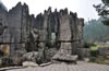 在香爐山背面,有一塊面積逾一平方公里的石頭城。仔細(xì)一看,這些石頭都象一座一座塔,參差不一,層數(shù)不一,最高的有八層,高二十余米;最起碼也有兩層,與人高低相近。他們形狀與人工堆砌的塔極相似,有基座,有沿有頂。近百座這樣的塔擁擠在一起,人穿行其間,迷離難尋歸途。因其數(shù)量多,便被游人譽(yù)為“千塔城”。