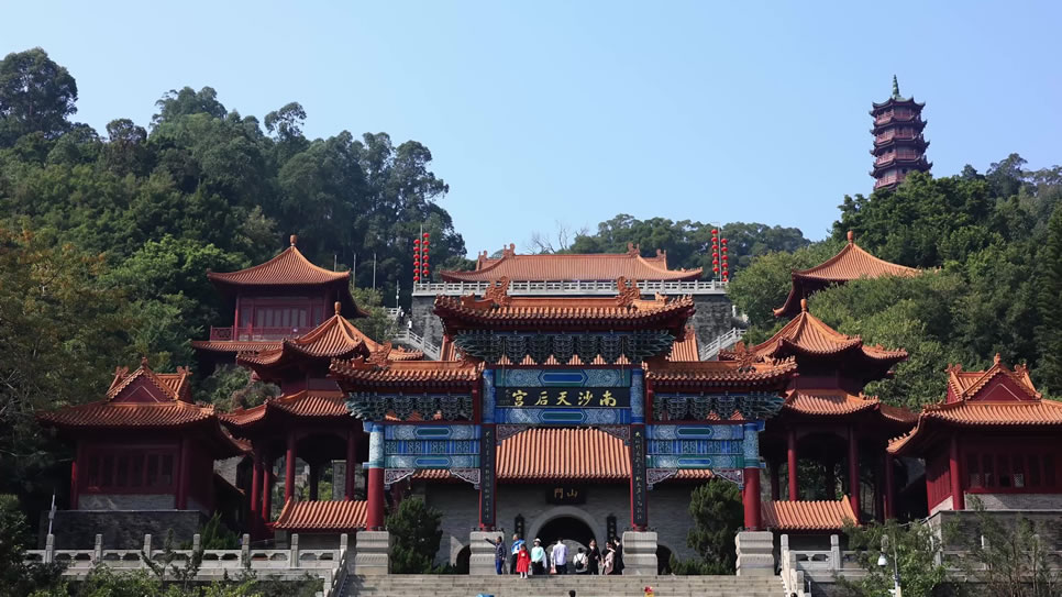 廣州南沙天后宮,又叫“媽祖廟”,位于廣東省廣州市南沙區(qū)天后路88號(hào),坐落于大角山東南麓,地處粵港澳大灣區(qū)之心,瀕臨珠江出?诘牧尕暄螅嫉孛娣e達(dá)18萬平方米。廣州南沙天后宮前身是明代建于鹿頸村的天妃古廟,清乾隆年間經(jīng)重修定名為元君古廟,抗戰(zhàn)時(shí)期被日寇飛機(jī)炸毀,而后于1994年重建。廣州南沙天后宮是為紀(jì)念海上女神林默而建,是一個(gè)以媽祖文化為主題的景區(qū),是粵港澳大灣區(qū)媽祖文化交流中心,亦是東南亞最大之媽祖廟。廣州南沙天后宮采用清式建筑對(duì)稱布局,高低錯(cuò)落地依山而建,建筑的特點(diǎn)集北京故宮的風(fēng)格和南京中山陵的氣勢(shì)于一體,規(guī)模為現(xiàn)今世界同類建筑之最。廣州南沙天后宮由廣場(chǎng)、宮殿和南嶺塔三部分構(gòu)成,“天后八景”包括:濱海銀灘朝陽(yáng)、五彩靈徑、媽祖靈釵、“南沙人”遺址、靈宮賜福、南嶺夕照、抗戰(zhàn)神炮、默娘之家八個(gè)景點(diǎn)。