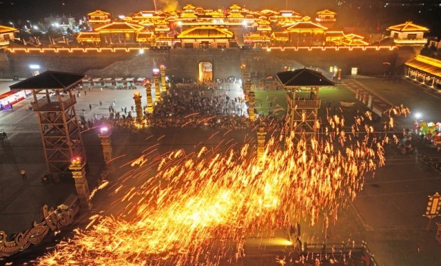 10月3日晚,游客在山東省臨沂市郯城縣郯國(guó)古城景區(qū)觀看打鐵花。新華社發(fā)(張春雷攝)