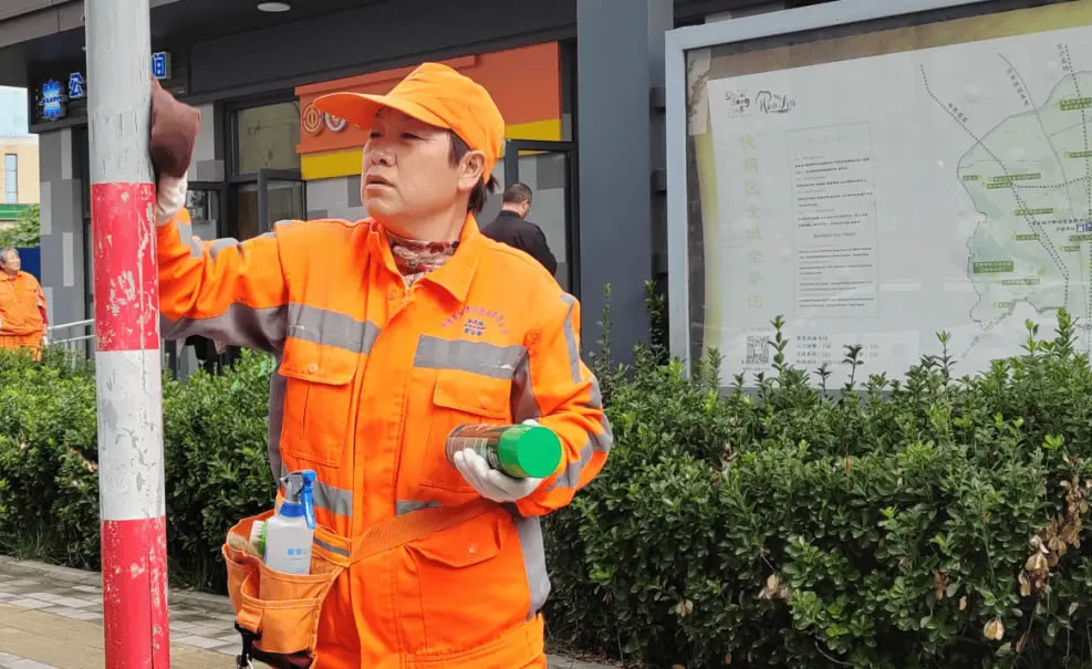 在槐蔭區(qū),環(huán)衛(wèi)工人馬增霞隨身攜帶“八寶袋”,對齊州路沿線的垃圾桶、路燈桿、公交站牌等進行清掃。“這個‘八寶袋’里有軟毛刷、硬毛刷、除膠劑、手套、噴壺等8種工具。”馬增霞介紹,“八寶袋”輕便易攜且取用便捷,可實現(xiàn)“一包在手,百污可除”,有效提升了主次干道人行道、交通出入口等重點區(qū)域的動態(tài)巡查處置效率;夾層內的清涼油、創(chuàng)可貼、速效救心丸,既為保潔人員提供安全防護,也能滿足市民應急需求。