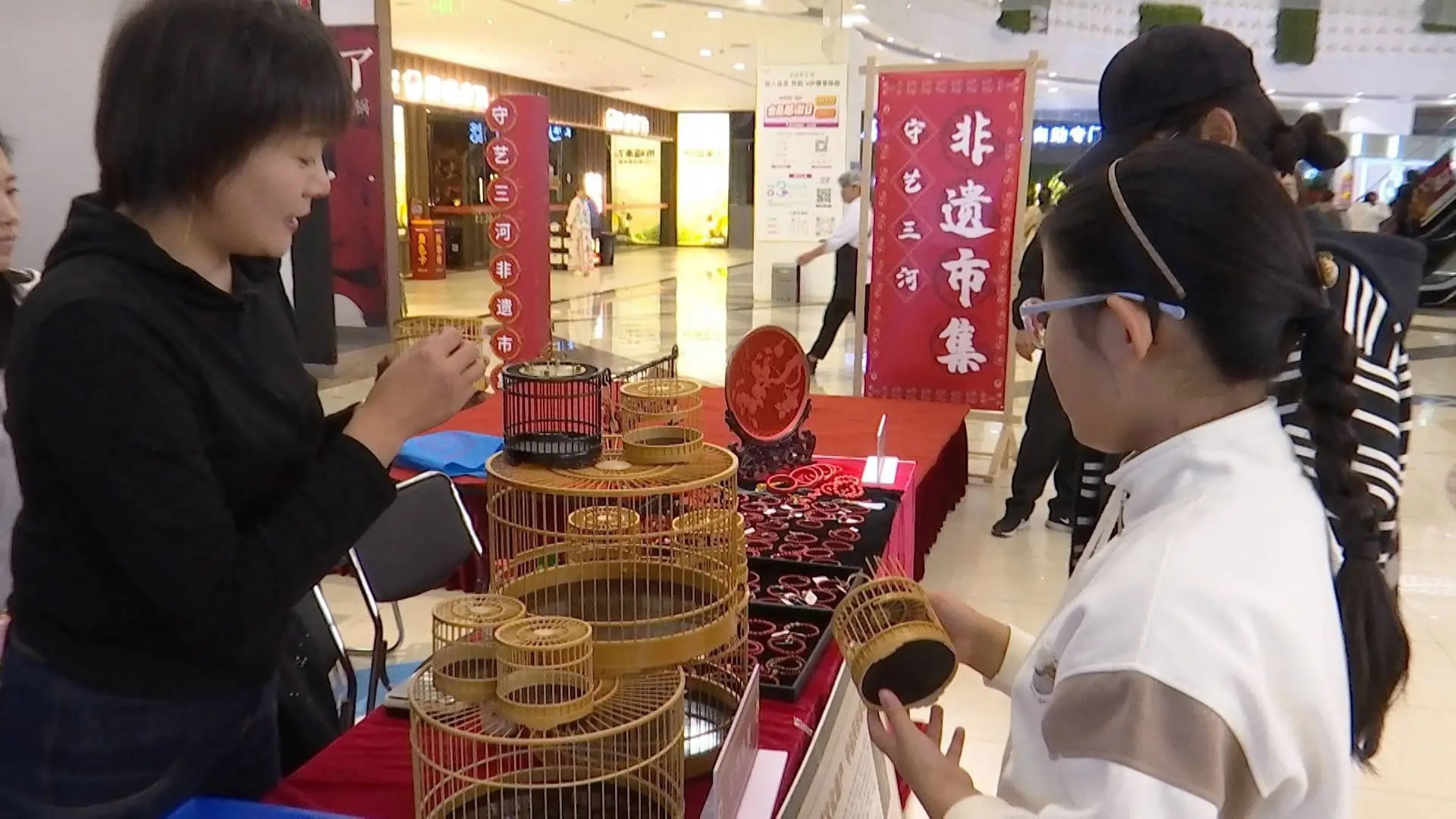 在三河喬鳥籠的攤位前,非遺傳承人正耐心地為一位小朋友講解鳥籠的制作奧秘,從選料到打磨,再到微小部件的精密組裝,精湛的技藝讓充滿好奇的孩子驚嘆不已。與此同時,在商場一樓的“守藝三河”非遺精品展示區(qū),包括鼻煙壺、三河喬鳥籠在內(nèi)的多項非遺產(chǎn)品,吸引著往來顧客的目光。