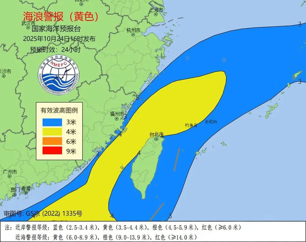 受強(qiáng)冷空氣的影響,預(yù)計(jì)10月24日下午到25日下午,東海南部、臺灣海峽將出現(xiàn)3米到5米的大浪到巨浪;福建近岸海域?qū)⒊霈F(xiàn)2.5米到3.8米的大浪,該近岸海域海浪預(yù)警級別為黃色,浙江南部近岸海域?qū)⒊霈F(xiàn)2米到3米的中浪到大浪,該近岸海域海浪預(yù)警級別為藍(lán)色。