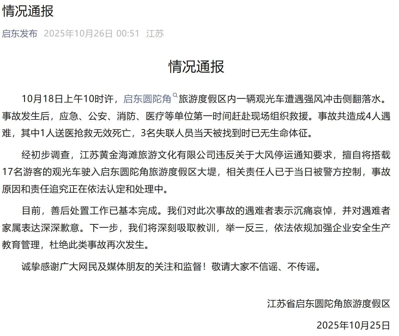 該通報稱,10月18日上午10時許,啟東圓陀角旅游度假區(qū)內(nèi)一輛觀光車遭遇強風(fēng)沖擊側(cè)翻落水。事故發(fā)生后,應(yīng)急、公安、消防、醫(yī)療等單位第一時間趕赴現(xiàn)場組織救援。事故共造成4人遇難,其中1人送醫(yī)搶救無效死亡,3名失聯(lián)人員當(dāng)天被找到時已無生命體征。