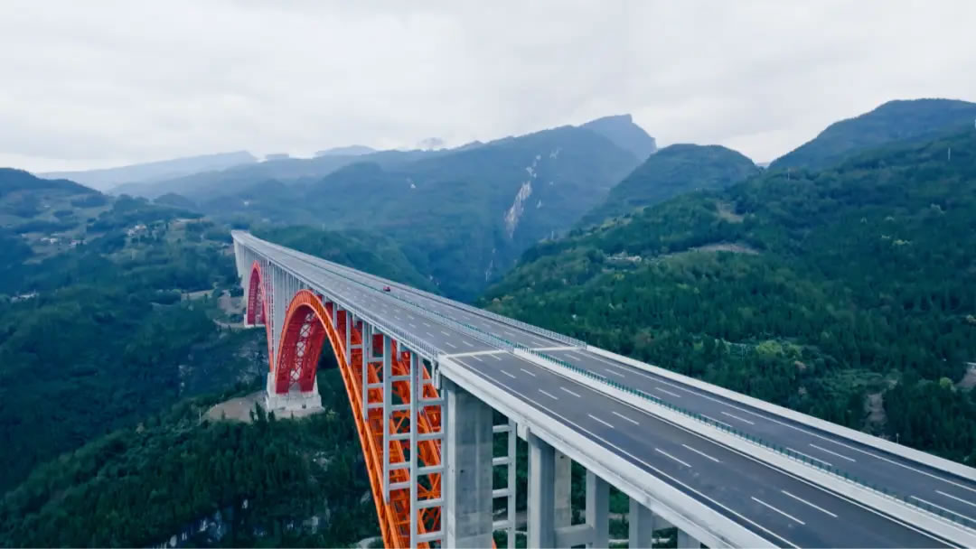 山澗云興霞蔚,雙虹飛跨天險。橙紅拱如晨曦暈染,勾勒群山力量曲線;簡潔的四肢鋼管,書寫出結構美學的動人詩篇。索道飛越,是工程與自然的和諧共舞;樁基深植,是技術與地質的真誠對話。雙堡特大橋連接山與山,更連接人與自然。