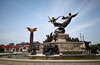 〔舞馬臺(tái)〕舞馬之所,舞馬是唐玄宗獨(dú)出心裁的大發(fā)明。《明皇雜錄》稱:“玄宗常教舞馬四百蹄,各為左右,分為部目,為某家寵,某家驕。時(shí)塞外亦有善馬來(lái)貢者,上俾之教司,無(wú)不曲盡其妙。因命衣以文繡,絡(luò)以金銀,飾其鬃鬣,間雜珠玉。奏其曲謂‘傾杯樂’者數(shù)十回。其馬奮首鼓尾,縱橫應(yīng)節(jié)。又施三重板床,乘馬其上,旋轉(zhuǎn)如飛,……每千秋節(jié)(玄宗生日)命舞于勤政樓下!薄督蜿(yáng)門》詩(shī)注:“其舞馬,安祿山亦將數(shù)匹以歸而私習(xí)之。其后,田承嗣代安有存者,一旦于廄上聞鼓聲,頓挫起舞,廄人惡之,舉篲以擊之,其馬尚為怒未妍妙,因更奮擊,宛轉(zhuǎn)曲盡其態(tài)。廝恐以告,承嗣以為妖,遂戮之,而舞馬自此絕焉!倍鸥Α抖冯u殿》詩(shī)“斗雞初賜錦,舞馬既登床”即言此。